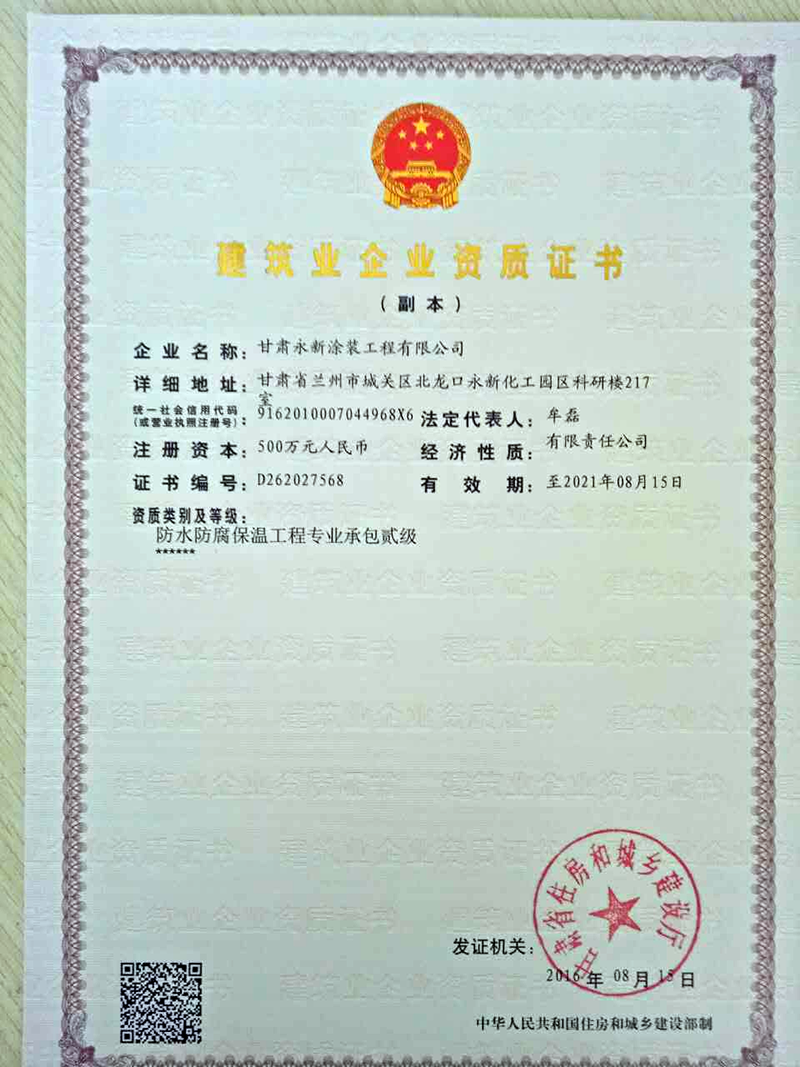公司简介:甘肃永新涂装工程有限公司是西北永新涂料有限公司为实现涂装一体化战略而下设的子公司,具有防水防腐保温工程专业承包二级资质和二级装饰装修资质,是集涂料营销、技术服务、涂装施工一体化的专业公司。